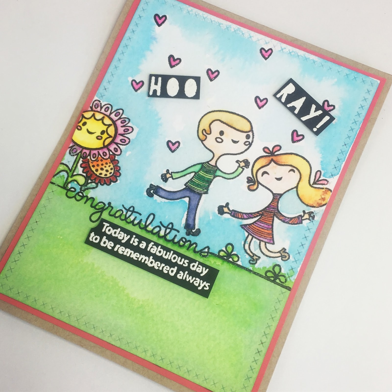 I started by stamping out the 'Congratulations' line form Sunday Sentiments. This sentiment set is still one of my all time favourites. I just love that my sentiment can give me the grounding for any scene I want to set up! I then stamped all my cool and kooky characters and flowers all around. I wanted the sweet happy couple to look like they were giddy with delight at their own happy news and dancing around their 'Congratulations' message. I added a scattering of hearts and coloured everything using my Zigs.
